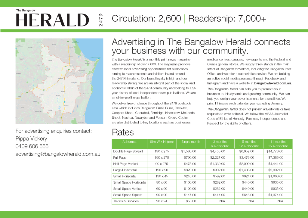 Contact Pippa Vickery on 0409 606 555 or email advertising@bangalowherald.com.au to find out more